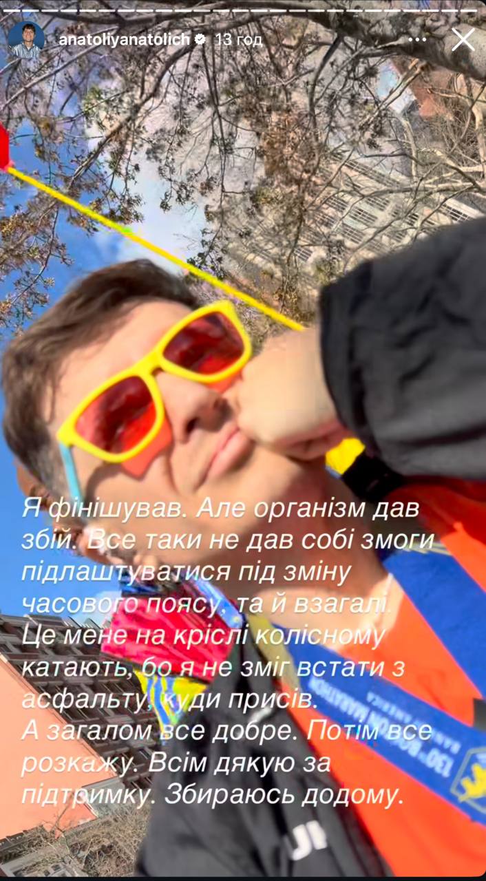 «З його слів протягом дистанції він тримав стабільно швидкий темп і навіть міг показати особистий рекорд. Проте приблизно за 5 кілометрів до завершення дистанції почалися сильні судоми, через які фактично відмовили ноги. Бігти далі він уже не міг, тож частину дистанції довелося долати пішки, іноді буквально переставляючи ноги руками. Попри це він дістався фінішу. На фініші Анатоліча пересадили у крісло колісне та доправили до швидкої допомоги, де медики надали допомогу», – йдеться у дописі.
