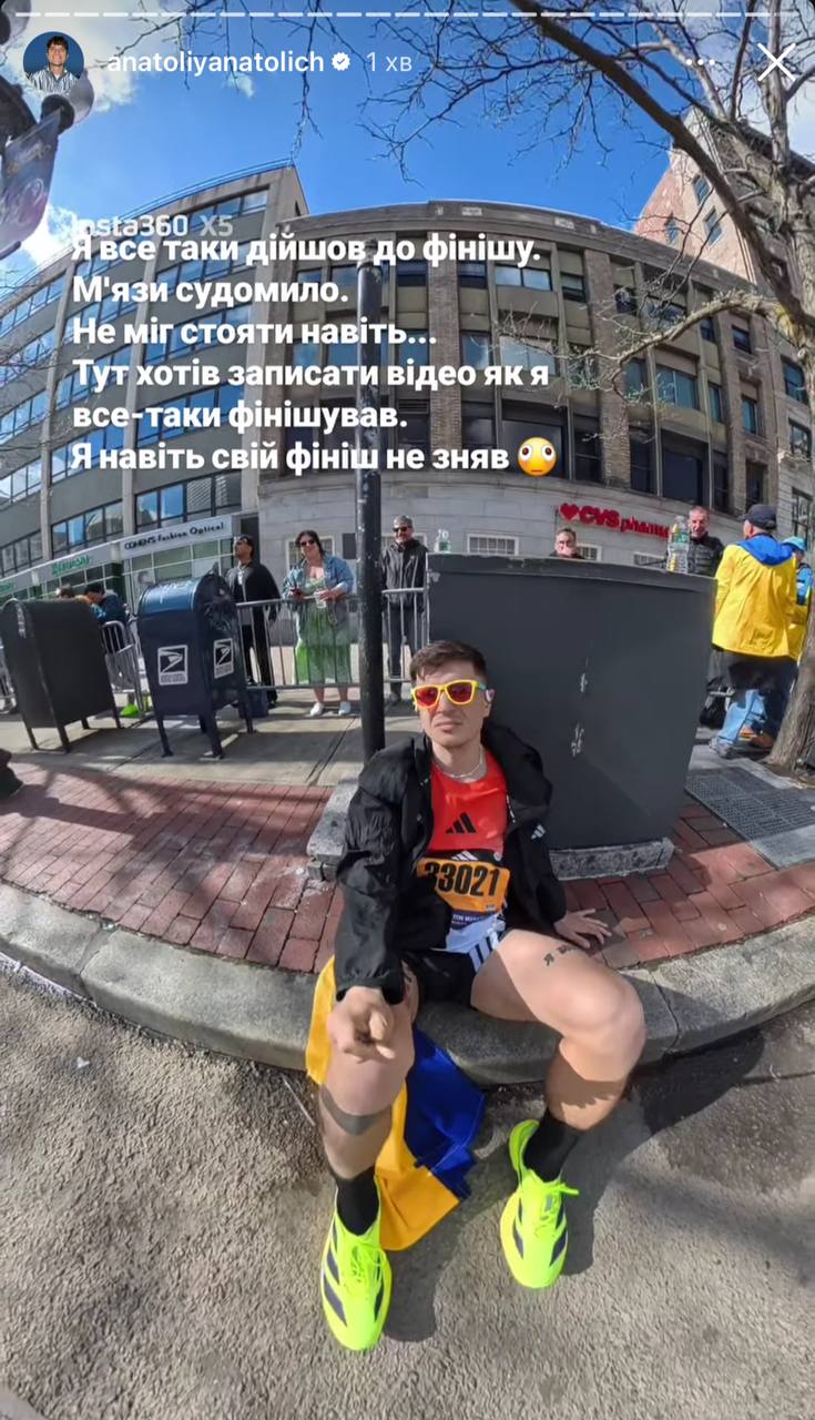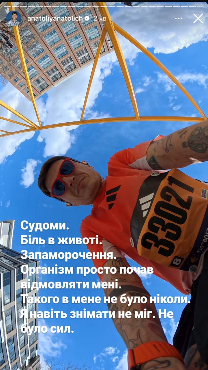 За словами спортсмена, він вперше зіштовхнувся з подібним станом, ближче до фінішу в нього почалися судоми, біль в животі та запаморочення. «Організм просто почав відмовляти мені. Такого в мене не було ніколи! Я навіть знімати не міг. Не було сил. Я все ж таки дійшов до фінішу. М'язи судомило. Не міг стояти навіть. Хотів записати відео як я все-таки фінішував. Я навіть свій фініш не зняв», – написав Анатоліч у сторис.