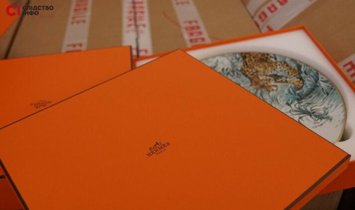 Сбоку в коридоре стоят большие коробки, внутри – меньшие коробки оранжевого цвета с логотипом Hermes Paris. Это роскошные тарелки и сервизы, которые стоят сотни, а иногда тысячи евро за единицу. К примеру, одна эта небольшая тарелка с изображением леопарда стоит 11 тысяч гривен. Посуда этой элитной марки в коробках – десятки или сотни штук.