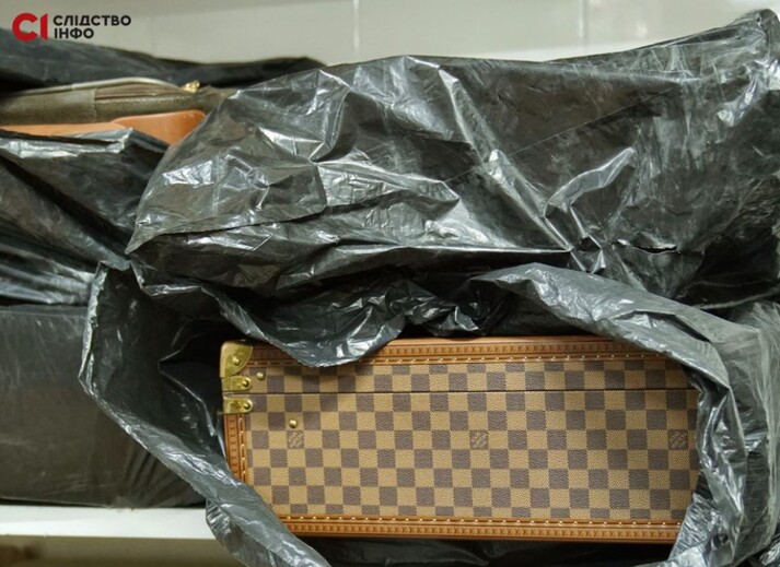 В подвале Медведчуки хранили чемоданы Louis Vuitton и другие дорогостоящие предметы. Из-под черного мусорного пакета виден чемодан, внешне напоминающий модель Louis Vuitton Alzer-80. На официальном сайте она стоит около 400 тысяч гривен.