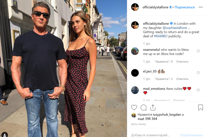 «В Лондоне со своей дочерью Софией Сталлоне… Готовы вернуться и приступить к промо-акции «Рэмбо», – подписал Сталоне снимок, размещенный в Instagram.