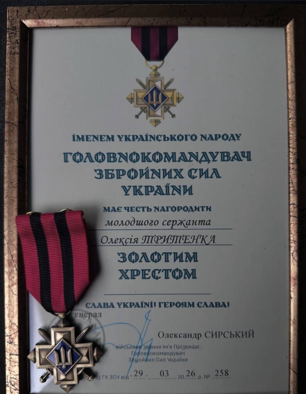 На фото, яким поділився Олексій Тритенко, можна побачити нагрудний знак та додаток до нього. «Іменем українського народу Головнокомандувач Збройних сил України має честь нагородити молодшого сержанта Олексія Тритенка «Золотим Хрестом», – йдеться в документі. Свій допис актор доповнив такими словами: «Служу українському народові!».