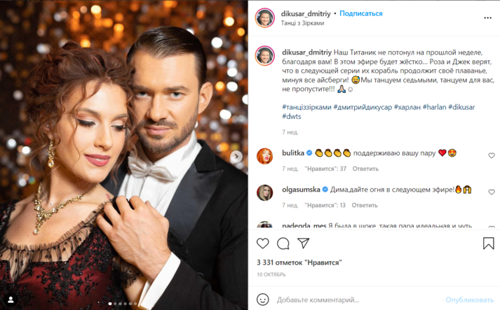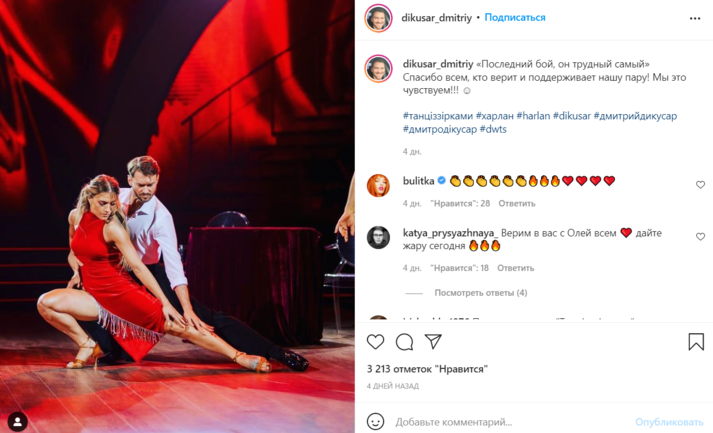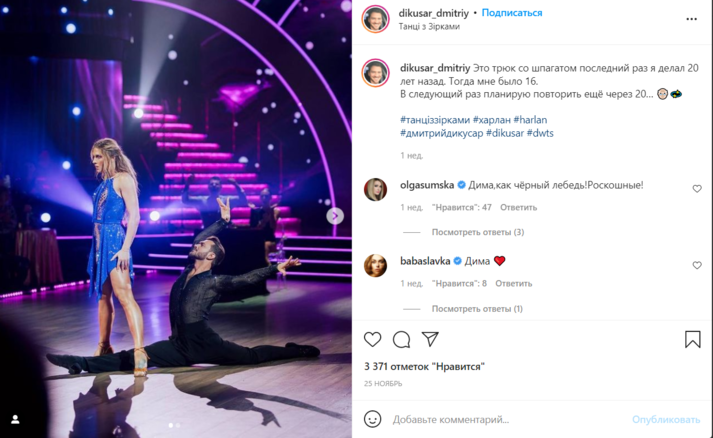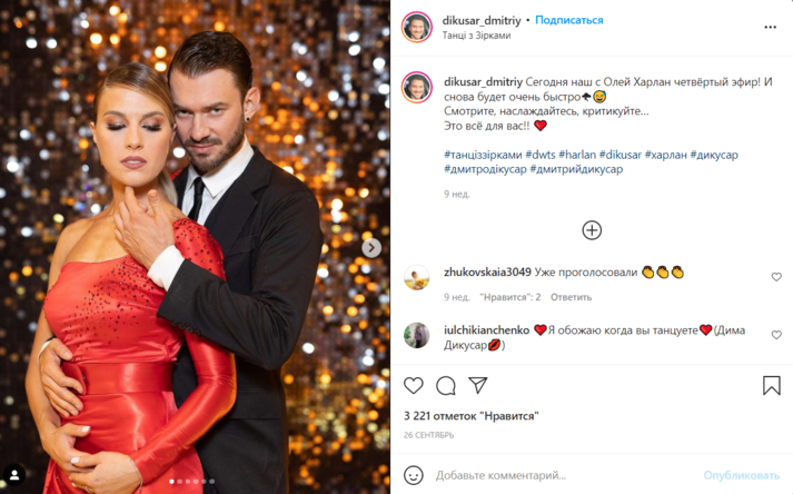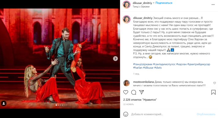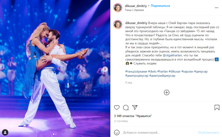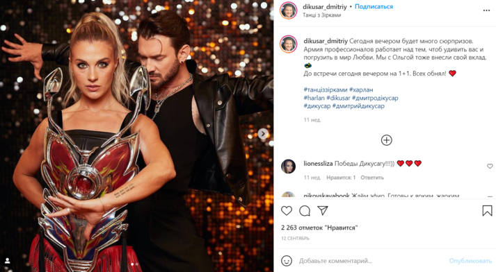 Известный украинский хореограф и участник «Танцев со звездами» Дмитрий Дикусар, который в паре с украинской спортсменкой Ольгой Харлан занял на проекте второе место в своем Инстаграме заявил, что очевидным фаворитом судей был актер Артур Логай.