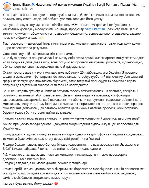 Білик наголосила, що не була присутня під час конфліктних розмов і не може оцінювати всі деталі ситуації. Водночас вона підкреслила, що відповідальність за проведення концерту лежить на людині, яка керує процесом і ухвалює рішення, необхідні для успішного виступу.