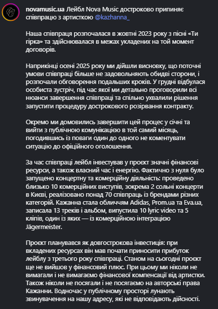 Лейбл Nova Music оприлюднив офіційну заяву, у якій підтвердив дострокове припинення співпраці з Кажанною. Команда зазначила, що ще наприкінці 2025 року сторони дійшли висновку, що умови співпраці не задовольняють обидві сторони.