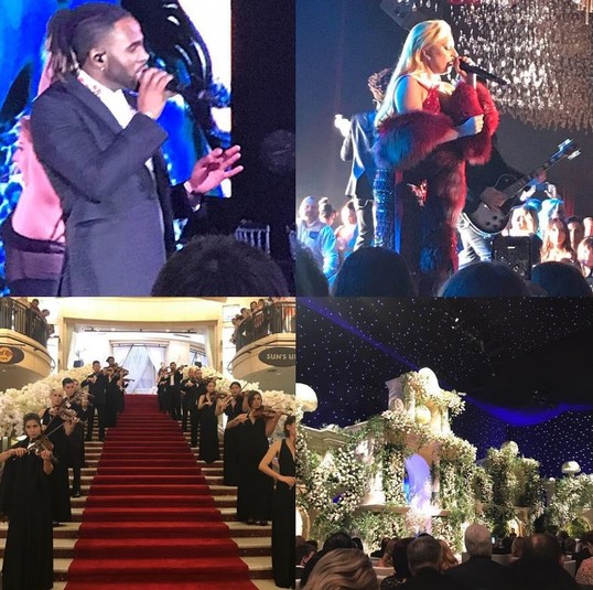 Ведущих праздника Андрея Малахова и Ксению Собчак, доставили в Лос-Анджелес частным самолетом. Гостей развлекали Леди Гага, Джейсон Деруло, Светлана Лобода, Николай Басков, Стас Михайлов и многие другие звезды. Также организаторы свадьбы привезли оркестр и балерин.