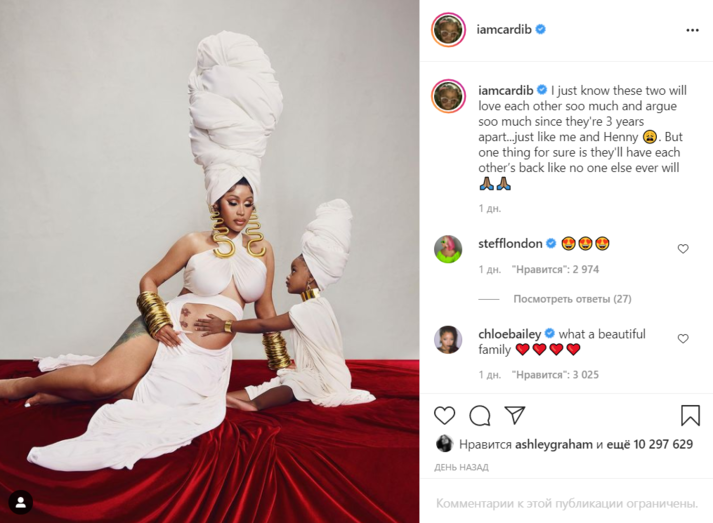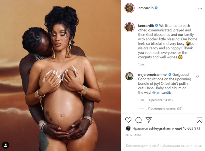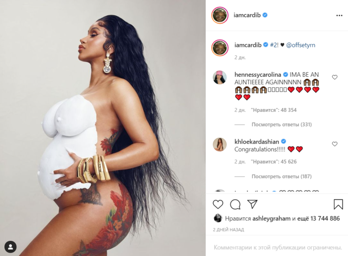 Откровенный кадр за считаные часы набрал около 11 млн просмотров, и рэпершу засыпали поздравлениями звезды и блогеры, среди которых оказались Хлои Кардашьян, Селена Гомес и Lil Nas X. Юзеры писали, что Карди отлично выглядит, и желали, чтобы у нее родился мальчик, так как звезда уже воспитывает дочку.