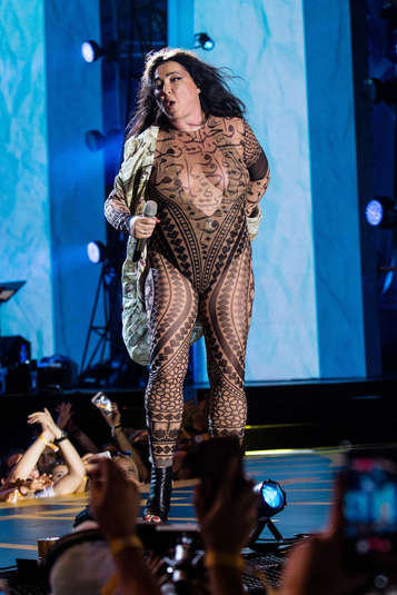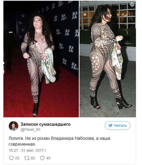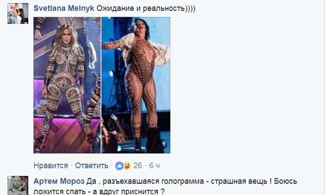 53-летняя певица вышла на сцену и исполнила две песни. Во время выступления скандальная артистка сняла с себя платье и осталась в прозрачном облегающем комбинезоне, который показал во всей красе располневшую фигуру Милявской.