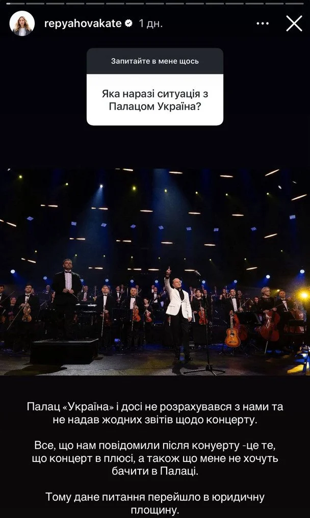Підписники Катерини Реп’яхової запитали в неї, яка наразі ситуація зі скандалом після концерту Віктора Павліка, який відбувся в Палаці «Україна». На це дружина співака відповіла в сторис: за її даними, Палац «Україна» й досі не розрахувався з ними після скандального концерту. Тож тепер родина Павліка вирішує це питання в юридичному контексті.