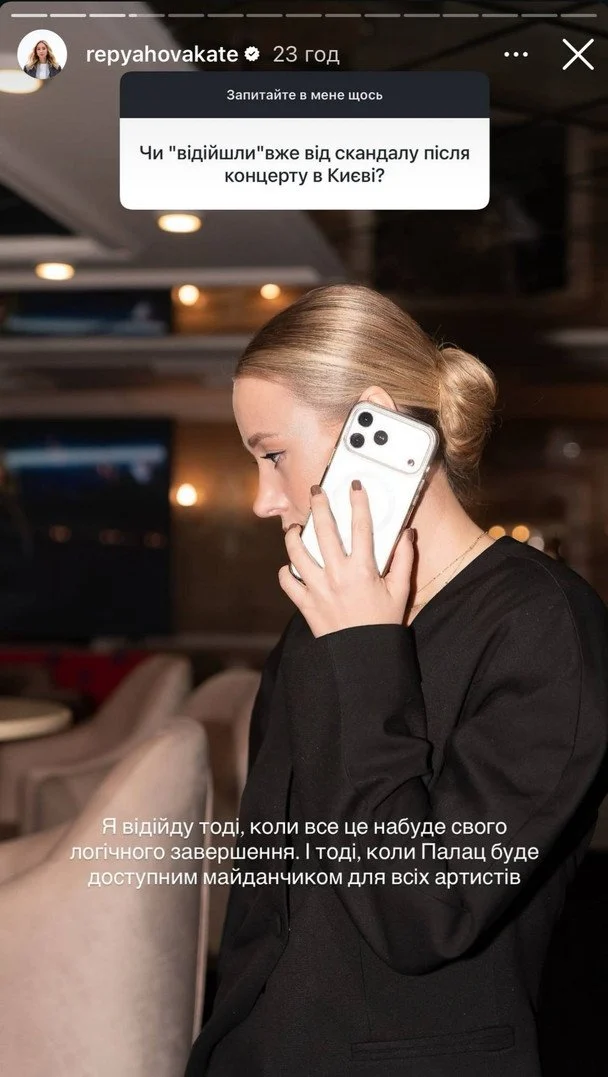 Також користувачі запитали Катерину Репяхову, чи оговталася вона після скандалу в Палаці «Україна». За словами жінки, для неї ця історія ще не завершилася.
