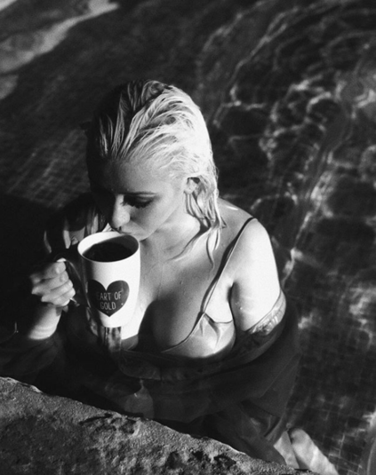 Как передает Dailymail, на снимках на светловолосой певице черное кружевное бюстье под черной кожаной курткой, а ее платиновые волосы завязаны черной тканью.