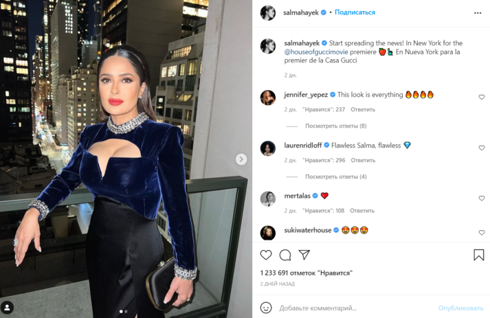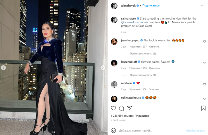 55-летняя Сальма Хайек подверглась критики из-за своего образа на премьере фильма «Дом Gucci» в Нью-Йорке. Об этом сообщает Daily Mail. Недавно актриса появилась в платье Gucci, которое представляло собой синий бархатный топ с глубоким декольте и черную длинную юбку.