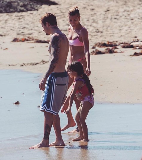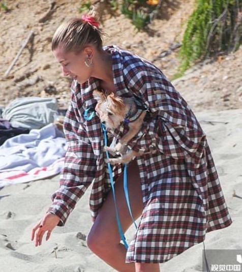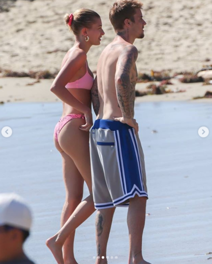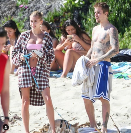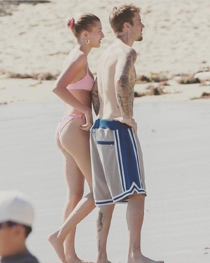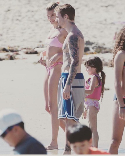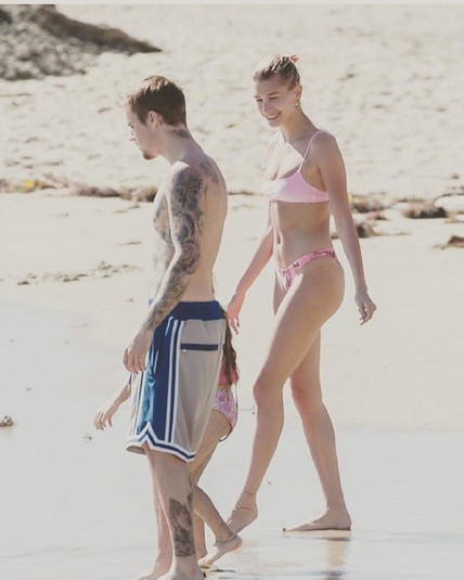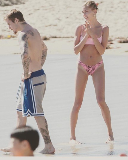 Джастин выбрал для купания серо-синие шорты, а Хейли предстала в розовом бикини и клетчатой рубашке. Пляжный образ дочери актера Стивена Болдуина дополнили серьги-кольца и пучок.