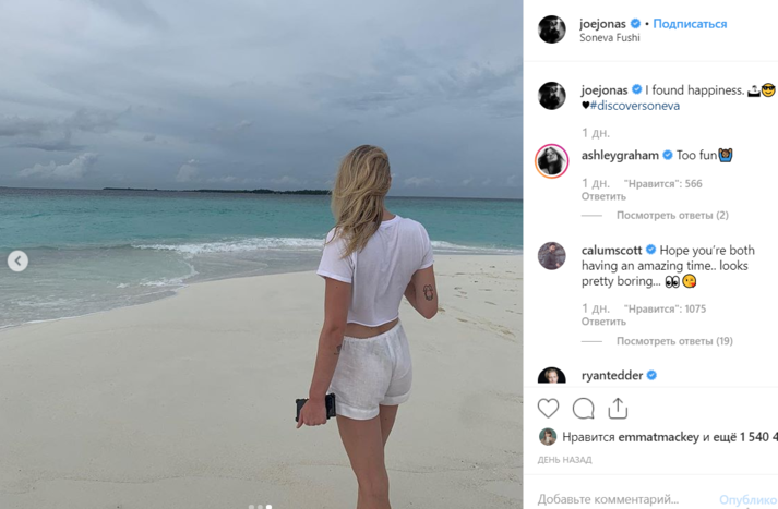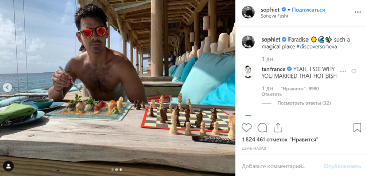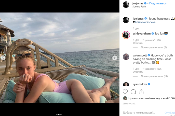 Оба артиста показали кадры с их медового месяца. Джонас опубликовал фотографию жены в нежно-розовом слитном купальнике. Актриса лежит на сетке для загара - она не накрашена, волосы собраны в хвост. Из украшений на Софи красивое обручальное кольцо, солнцезащитные очки подобраны в тон купальнику.