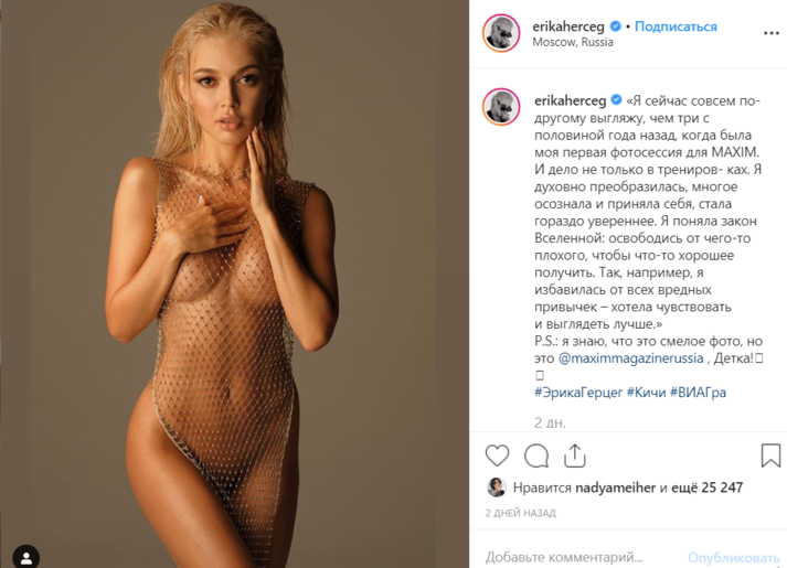 «Я сейчас выгляжу по-другому, чем три с половиной года назад, когда была моя первая фотосессия для Maxim. И дело не только в тренировках. Я духовно изменилась, многое осознала и приняла себя, стала намного увереннее. Я поняла закон Вселенной: освободись от чего-то плохого, чтобы что-то хорошее получить. Так, например, я избавилась от всех вредных привычек - хотела чувствовать и выглядеть лучше», - рассказала Герцег.