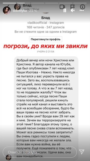 А сегодня певица на своей странице в Инстаграм поделилась новой новостью: ей написал владелец ютуб-канала, где размещена песня, с угрозами: «Никто не пытался украсть у вас права на песню. Зато вы, воспользовавшись ситуацией, перевернули все с ног на голову. Почему семь лет назад не подавали жалобу? Зачем сейчас, когда песня стала популярной, решили кинуть страйк на мой канал и выставить это на публику Вы в своем уме? Благодаря этому треку о вашей песне снова начали вспоминать. Может все ремиксы тоже запретить? Вы очень гадко поступили к людям, которые вам никогда не желали зла. Если вам нужна война, вы ее получите. Еще пожалеете о том, что сказали и написали. Удачи вам, она вам понадобится»