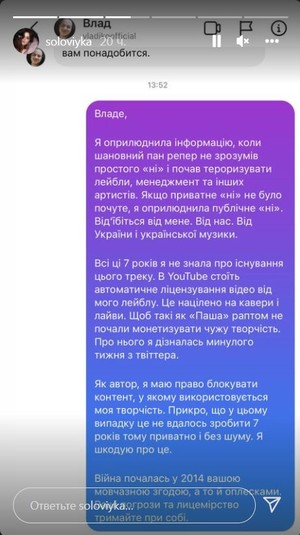Вчера певица Христина Соловий возмутилась на своей странице в Инстаграм, что российский исполнитель без разрешения использовал ее песню «Тримай» для своей композиции. Певец оставил припев в исполнении Христины, а вместо куплетов добавил свой рэп на русском языке. «Осквернил мою песню, изуродовал мой голос, и наваливает с ней свой русский рэп в тиктоках и ютубе», – написала Соловий.