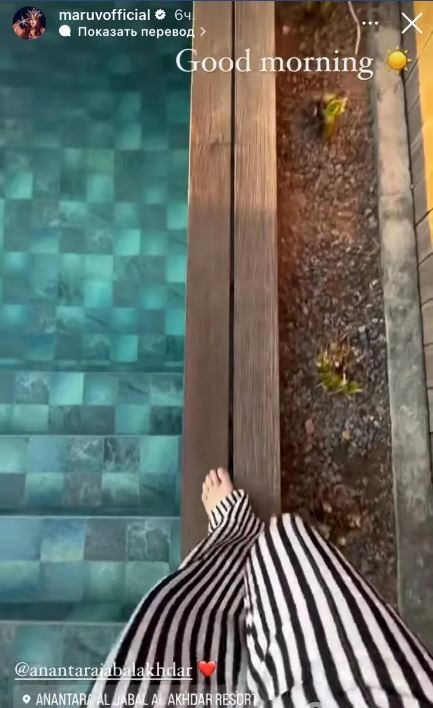 Судячи з геовідмітки, співачка знаходиться на курорті в Омані. Ця держава розташована в Південно-Західній Азії і межує з Саудівською Аравією, ОАЕ та Єменом. З кадрів, які публікує Maruv, видно, що там вона займається боксом, грає у баскетбол, пише нові пісні та просто відпочиває біля басейну.