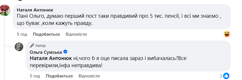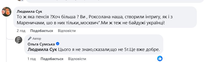 Користувачі соцмереж почали активно запитувати, яку саме пенсію отримує Зінкевич. У відповідь Ольга Сумська зазначила, що не знає, однак запевнила, що це не 5 тис. грн, як вона писала раніше. Водночас деякі коментатори наполягають, що саме ця сума відповідає дійсності.