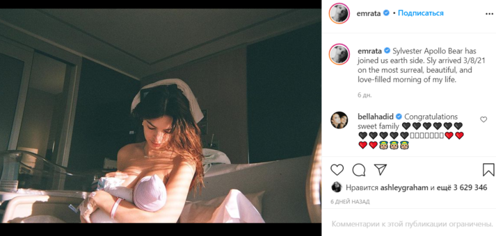Звезда также показала своих родных. Эмили запечатлела мужа Себастьяна Биар-Маккларда с новорожденным. Малыш Сильвестр в забавной полосатой шапочке, укутанный в бирюзовую шаль, лежал у отца на руках. Муж Ратаковски с нежностью посмотрел на ребенка. Пес Коломбо тоже находился рядом с ними. «Самый лучший старший брат», — написала Эмили.