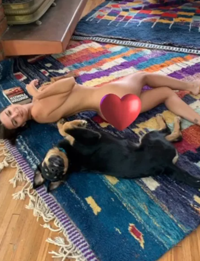 Инстадива позировала в домашней обстановке. Актриса фильма «Красотка на всю голову» расположилась на ковре рядом с любимым псом Коломбо. Молодая мама позировала полностью обнаженной, гордо демонстрируя подтянутые ягодицы и постройневшую талию. Звезда повторила позу своего питомца и мило улыбнулась.