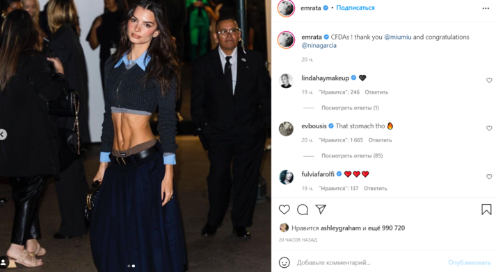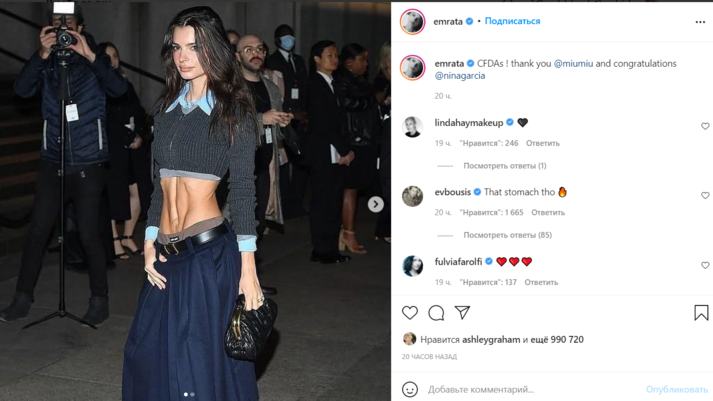 Эмили обратилась к бодишеймерам, которые, по ее мнению, негативно отреагируют на ее фигуру. «Я не публиковала этот снимок, потому что знала, что он вызовет споры. Но это мое тело, и я не собираюсь опускаться до шеймеров!» — подписала фото 30-летняя модель.