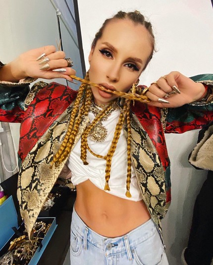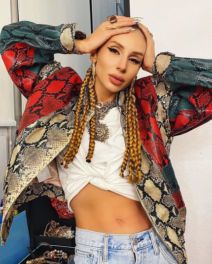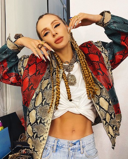 На новом фото Лобода предстала в белой футболке и джинсах. Дополнила образ косуха оверсайз со змеиным принтом. Певица сделала яркий макияж с акцентом на губы и продемонстрировала новую прическу. В отличие от коллег, артистка решила не стричься, а заплести трендовые косички — боксерские косы с канекалоном (искусственные волосы).