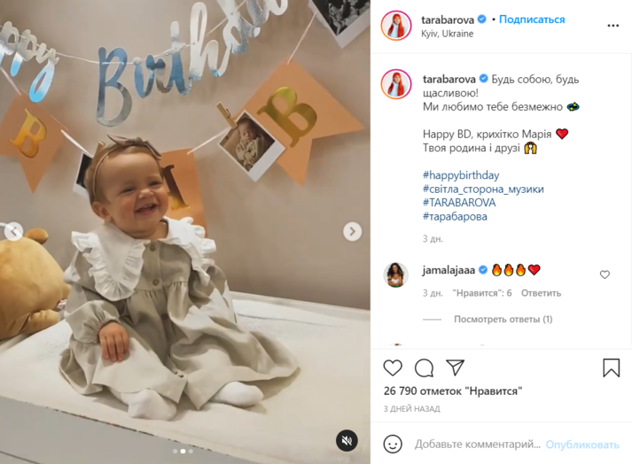 «Будь собой, будь счастливой! Мы любим тебя безгранично! Счастливого дня рождения, крошка Мария! Твоя семья и друзья», – с нежностью подписала кадры Тарабарова.