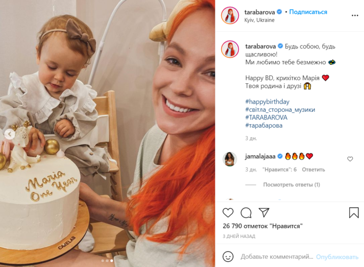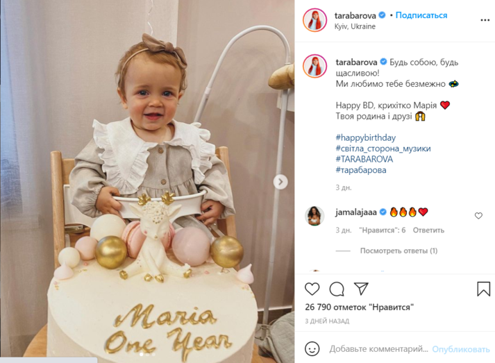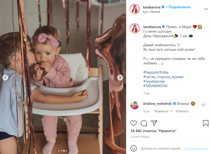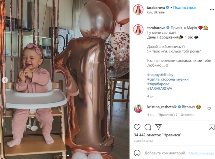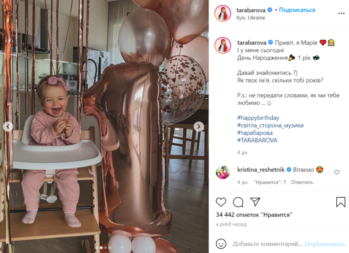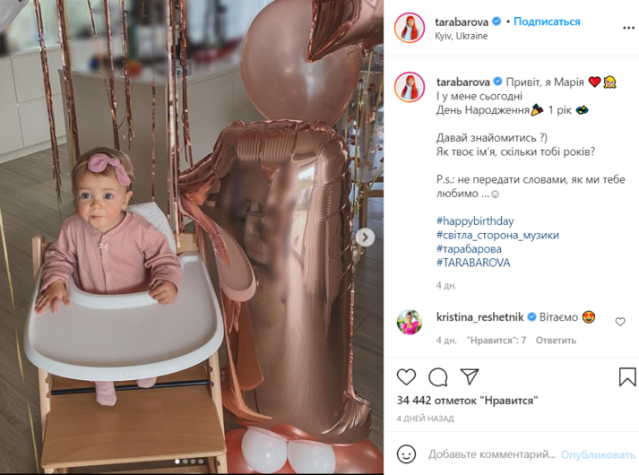 Популярная украинская певица Светлана Тарабарова в своем Инстаграме опубликовала яркие фото с празднования первого дня рождения дочери Марии.