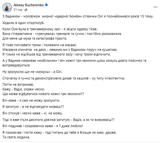 «З Вадимом – чоловіком мирної «ядерної бомби» співачки Олі я познайомився років 15 тому. Ходили в один спортклуб. Коли Оля була в тренажерному залі, я звідти одразу тікав. Вона гіперактивна – «тренувала» тренерів та гучно й постійно розмовляла. Для мене це мука та катастрофа просто. Я тікав поплавати трохи й полежати на масажі», – написав політик.