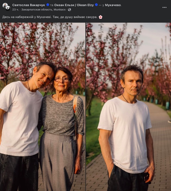 Напередодні Великодня, лідер гурту «Океан Ельзи» Святослав Вакарчук приїхав до Мукачева, де разом зі своєю мамою Світланою Олександрівною прогулявся затишними вуличками. Відповідне фото він опублікував у соцмережах, передає «Главком».