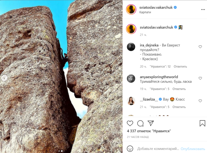 «Карпаты. Отпуск», – лаконично подписал Святослав Вакарчук инстаграм-сторис.