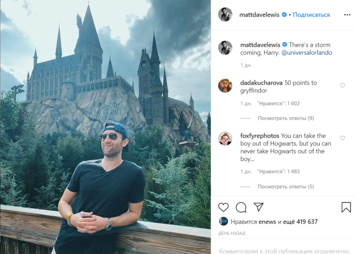 Однако создателям парка развлечений во Флориде удалось почти полностью воссоздать Хогварстс, каким его запомнили зрители. И, нужно признать, красавчик Мэттью отлично смотрится на фоне этого роскошного дворца.