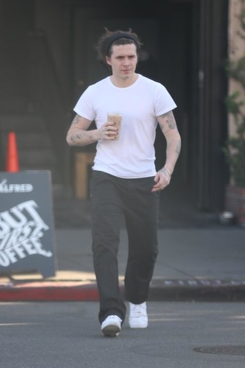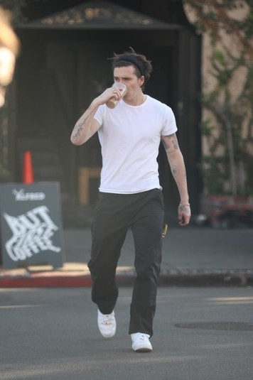 20-летний Бруклин Бекхэм попал в объективы папарацци в расслабленном образе. Начинающий фотограф спешил на встречу со своей новой возлюбленной. Сын Дэвида и Виктории Бекхэм выбрал наряд в стиле casual. Он надел классическую белую футболку, черные джинсы и белые кроссовки.