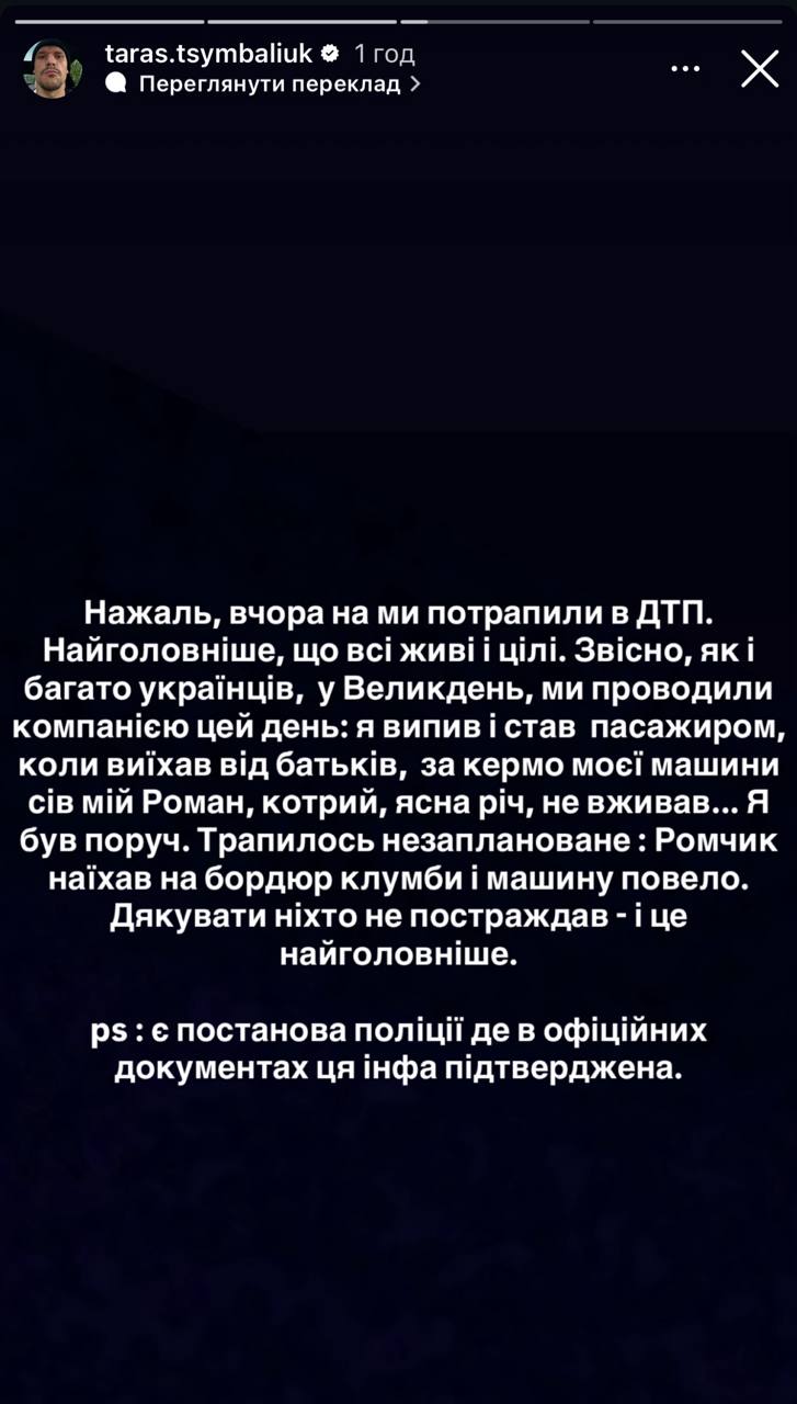 Актор спростував закиди про те, що він був за кермом у нетверезому стані. «Нажаль, вчора ми потрапили в ДТП. Найголовніше, що всі живі і цілі. Звісно, як і багато українців, у Великдень, ми проводили компанією цей день: я випив і став пасажиром, коли виїхав від батьків, за кермо моєї машини сів мій Роман, котрий, ясна річ, не вживав... Я був поруч. Трапилось незаплановане. Ромчик наїхав на бордюр клумби і машину повело. Дякувати ніхто не постраждав – і це найголовніше. ps: є постанова поліції де в офіційних документах ця інфа підтверджена», – написав Тарас Цимбалюк.