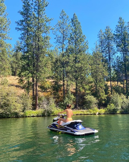 Пикантный наряд подчеркнул золотистый загар модели, ее плоский живот и округлые бедра. «Я люблю озера», - написала Дженнер.