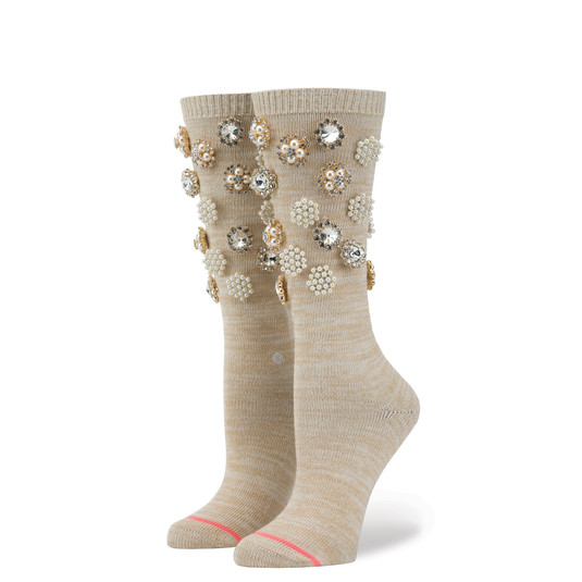Серые, молочные и бордовые носки расшиты камнями и сплетены из нитей разных оттенков, включая блестящий люрекс.