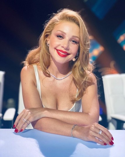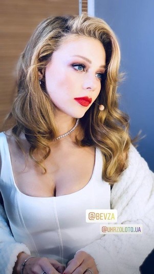 На лице Тины Кароль – традиционная яркая помада красного цвета и легкий макияж. Look исполнительница и судья Национального отбора дополнила изысканной прической с лаконичными локонами.