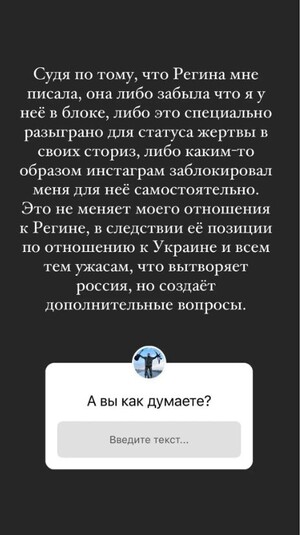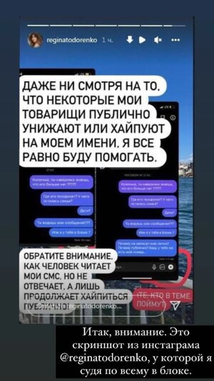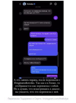 «Судя по тому, что Регина мне писала, она либо забыла, что я у нее в блоке, либо это специально разыграно для статуса жертвы, либо Instagram заблокировал меня для нее самостоятельно. Это не меняет моего отношения к Регине вследствие ее позиции по отношению к Украине и всем тем ужасам, что вытворяет Россия, но создает дополнительные вопросы», – прокомментировал слова Тодоренко Серга.