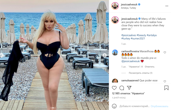Джессика Альвес, которая в прошлом была знаменита как «живой Кен», теперь хвастается на отдыхе в Турции своими женственными формами. И это несмотря на то, что две недели назад ей была проведена операция на желудке. Похоже, для 37-летней теперь уже женщины это привычное дело, ведь Джессика прошла через бессчетное количество хирургических вмешательств, сообщает Daily Mail.