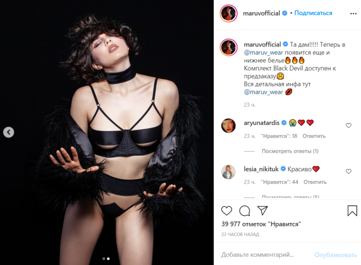 На опубликованных в соцсети кадрах поп-звезда попозировала в комплекте нижнего белья черного цвета. Судя по подписи публикации, она прорекламировала свою продукцию. Большинство подписчиков восхитились образом Корсун и оставили немало хвалебных комментариев.