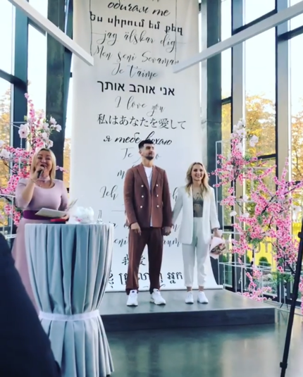 Торжество прошло 18 октября в Киеве. В качестве свадебных нарядов молодожены выбрали брючные костюмы и кроссовки. После того как регистратор объявила о создании новой семьи, Дмитрий и Яна поцеловались и исполнили зажигательный танец.