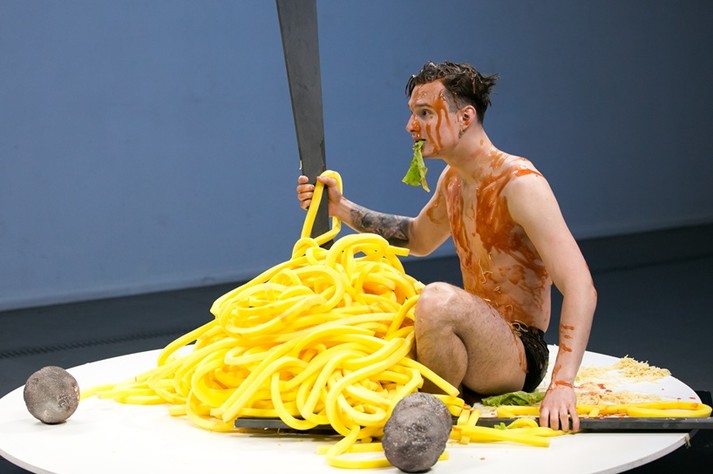 Участники в одном белье должны были позировать в огромной бутафорской тарелке с макаронами. А для пущей убедительности посреди съемки их поливали настоящим кетчупом и посыпали настоящими спагетти и овощами.