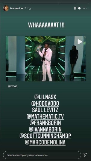 Украинская клипмейкер Таня Муиньо одержала победу в одной из самых престижных премий мира MTV Video Music Awards в номинации «Лучшая режиссерская работа». Она снимала клип Montero для эпатажного рэпера Lil Nas X.