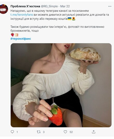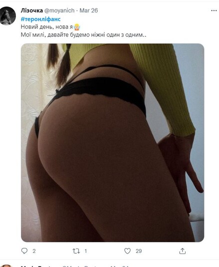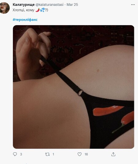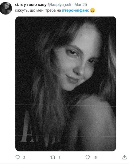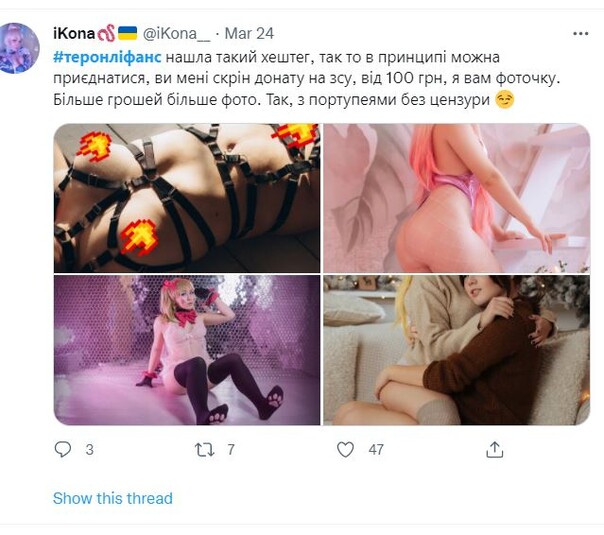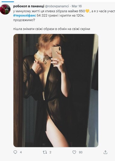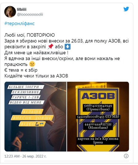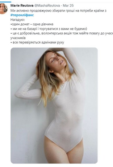 Две Насти из Украины и Беларуси (фамилии и города журналисты по просьбе героинь не называют) – придумали необычный способ волонтерства – девушки отправляют интернет-пользователям интимные фото за пожертвования для ВСУ. За 19 дней деятельности учредительницам так называемого Теронлифанса удалось собрать около 4 миллионов гривен на нужды украинских защитников. Сейчас они работают не сами, а вместе с целым «штатом сотрудниц».