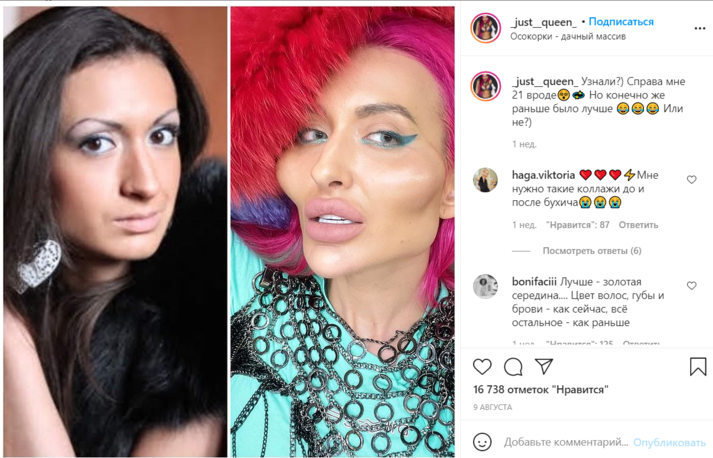 Анастасия поделилась в Инстаграме коллажем, продемонстрировав значительную разницу во внешности, которая наблюдалась ещё не так давно. Слева — на фото 2018 года — блогерша предстала со светлыми волосами, а ее губы и скулы ещё не были гипертрофированных размеров. На снимке справа девушка показала, как выглядит сейчас.
