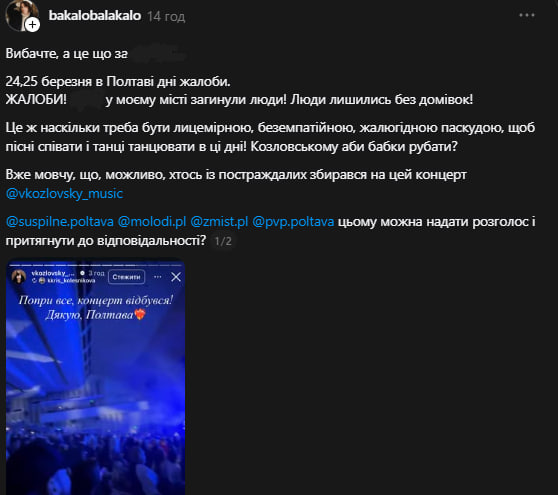 «24 і 25 березня в Полтаві Дні жалоби. Жалоби! У моєму місті загинули люди! Люди залишились без домівок! Це ж настільки треба бути лицемірною, беземпатійною, жалюгідною паскудою, щоби пісні співати й танці танцювати в ці дні! Козловському аби бабки рубати!» – написала користувачка.