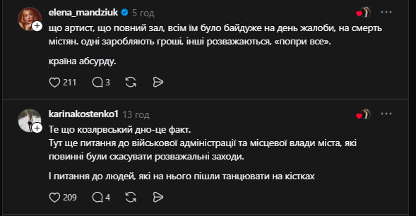 У коментарях під дописом Марини, думки користувачів розділилися. Дехто погодився з авторкою допису та підтримали її, одна з них була блогерка Олена Мандзюк. «Що артист, що повний зал, усім їм було байдуже на день жалоби, на смерть містян. одні заробляють гроші, інші розважаються, «попри все».
