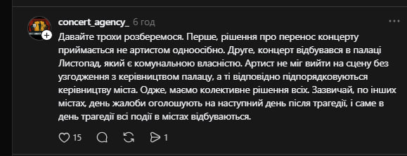 - «Скажу прямо: мене дивують такі дописи! 24–25 березня дні жалоби в Полтаві, це трагедія, із цим ніхто не сперечається. Але давайте без подвійних стандартів. Концерти плануються за місяці: зал, команда, техніка, квитки».