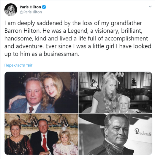 «Я глубоко опечалена смертью моего деда Баррона Хилтона. Он был легендой и визионером, великолепным, красивым и добрым, он жил жизнью, полной достижений и приключений», – написала в твиттере его внучка Пэрис Хилтон.